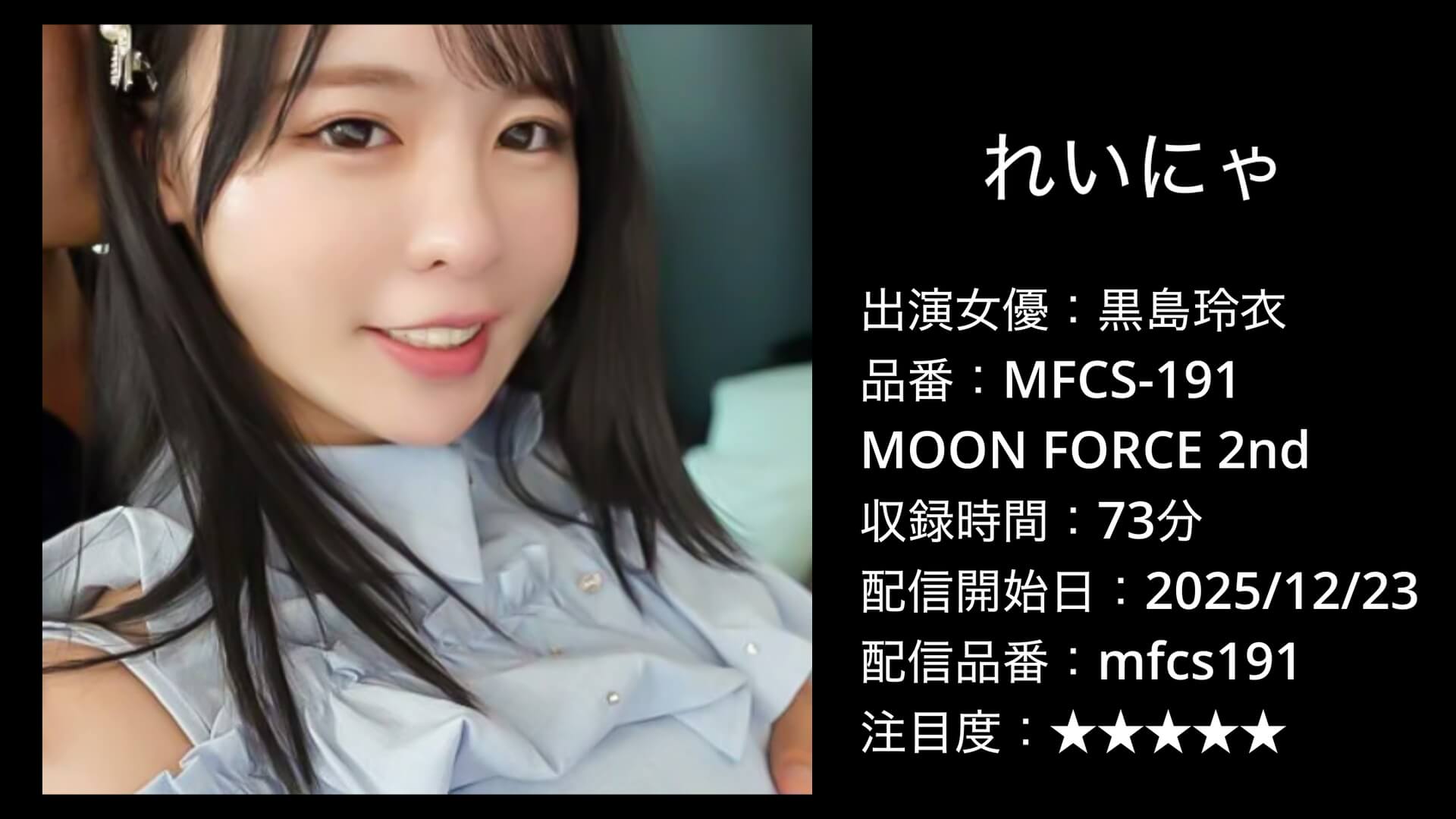 今回ご紹介するのは、MOON FORCE 2ndから配信された「れいにゃ」(品番MFCS-191)。出演は黒島玲衣さんです。