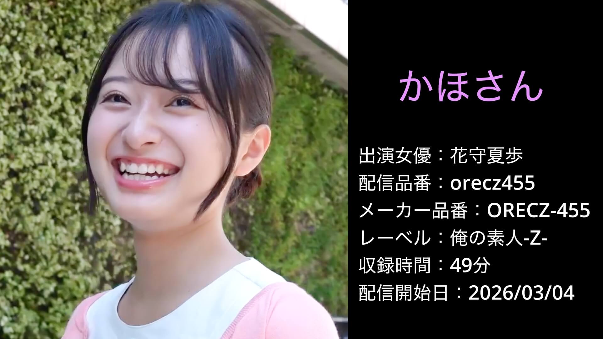 今回ご紹介するのは、俺の素人-Z-配信の「かほさん」(メーカー品番 ORECZ-455/配信品番 orecz455)です。看護師設定をベースに、落ち着いた雰囲気と色気を両立させた構成になっています。