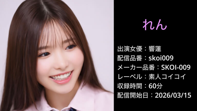 今回ご紹介するのは、素人コイコイ配信の「れん」(メーカー品番 SKOI-009/配信品番 skoi009)です。本作は“恋愛番組の裏側で、表の顔とは違う表情が少しずつ見えてくるところ”がわかりやすい作品です。
