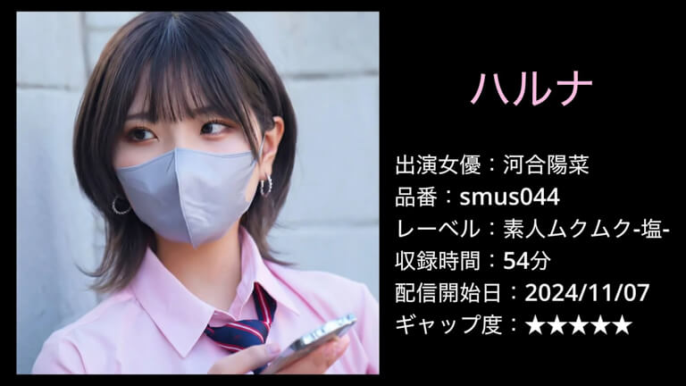 今回ご紹介するのは、素人ムクムク-塩-配信の「ハルナ」(メーカー品番 SMUS-044/配信品番 smus044)です。本作は“塩対応の空気を保ちながら、河合陽菜さんの反応が少しずつ変わっていく流れ”を中心に構成されています。