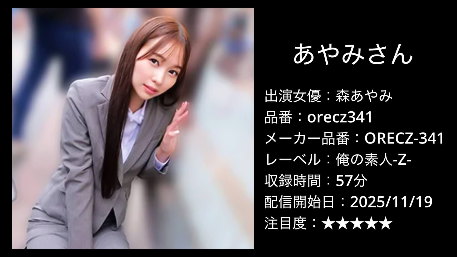 今回ご紹介するのは、レーベル「俺の素人-Z-」から配信された作品「あやみさん」(品番:orecz341)。出演は森あやみさんです。