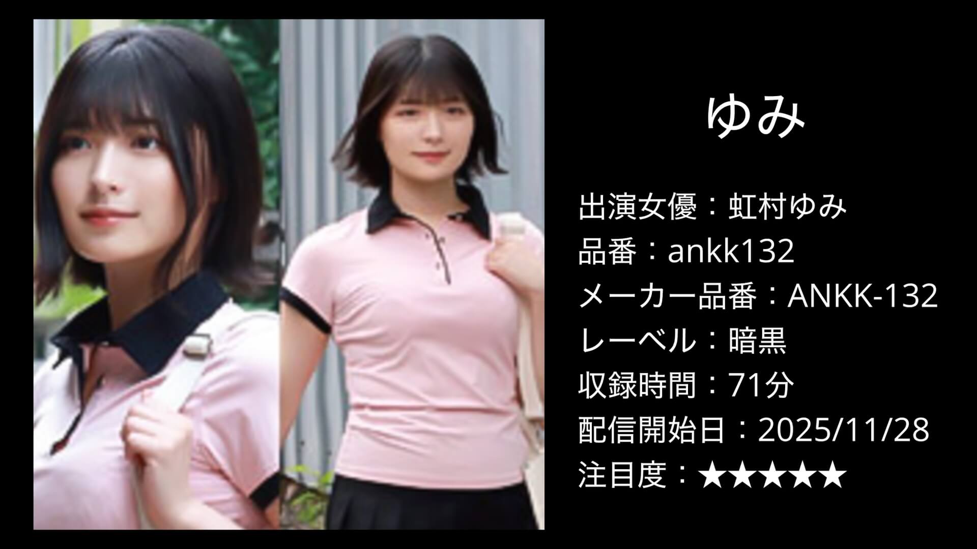 今回ご紹介するのは、暗黒レーベルから配信された「ゆみ」(品番:ankk132)。出演は虹村ゆみさんです。